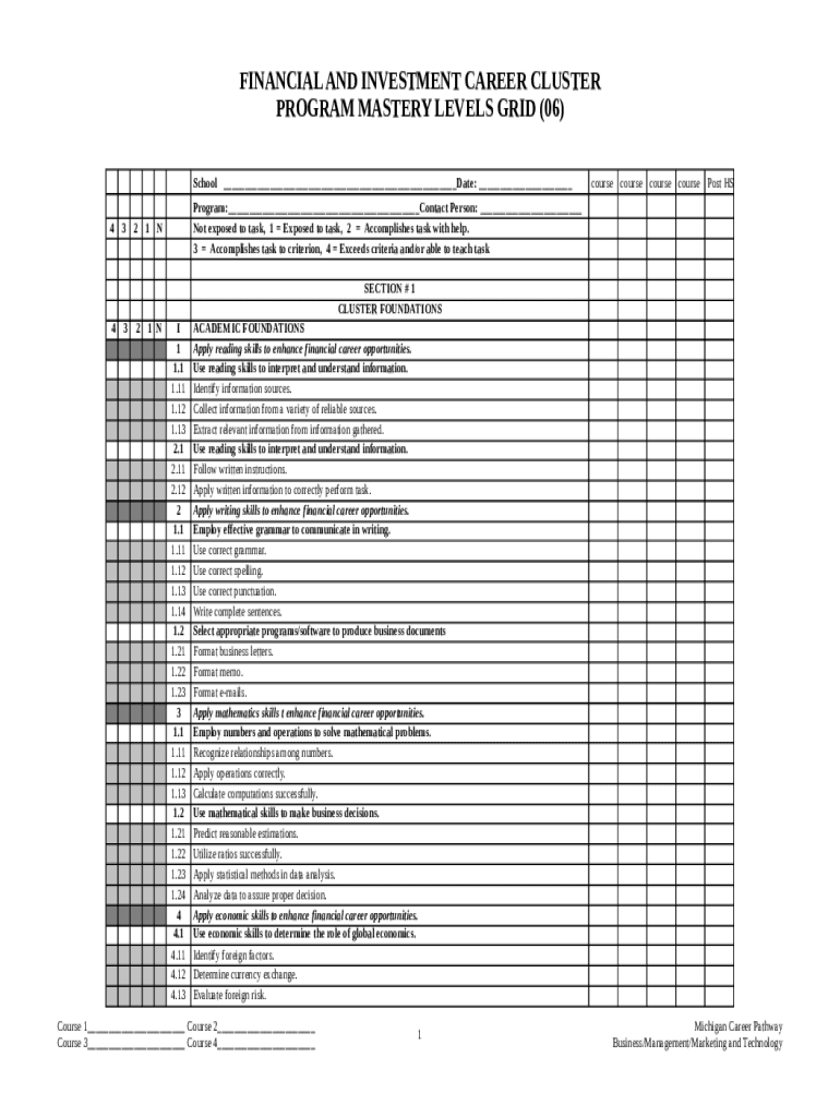 Get the free Financial and Investment Career Cluster Program Mastery Levels Grid