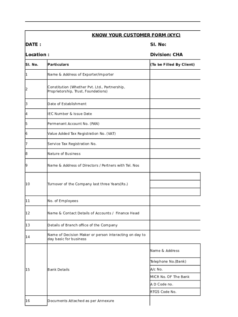 KNOW YOUR CUSTOMER FORM (KYC) DATE :SI. No:Location :Division: CHASE. No. Particulars(To be Filled By Client)1Name & Address of Exporter/importer2Constitution (Whether Pvt. Ltd., Partnership, Proprietorship,