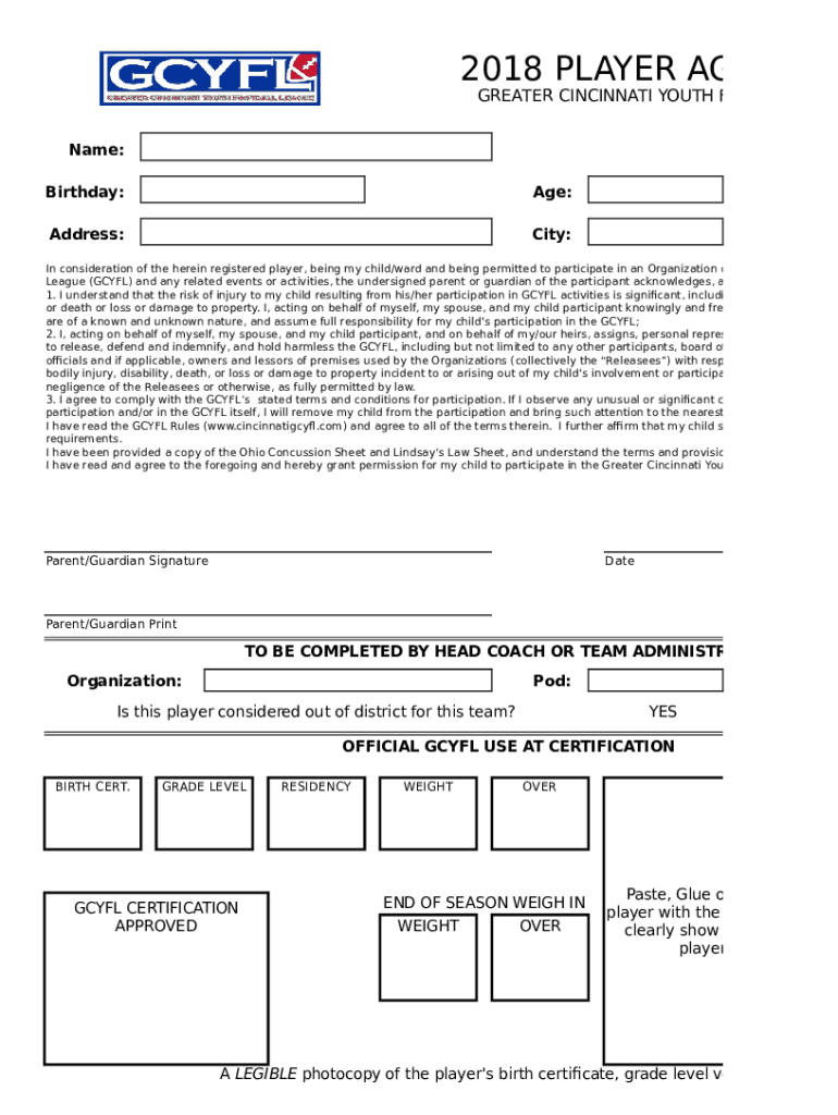 2018 PLAYER AGREEMEGREATER CINCINNATI YOUTH FOOTBALL Leakage: