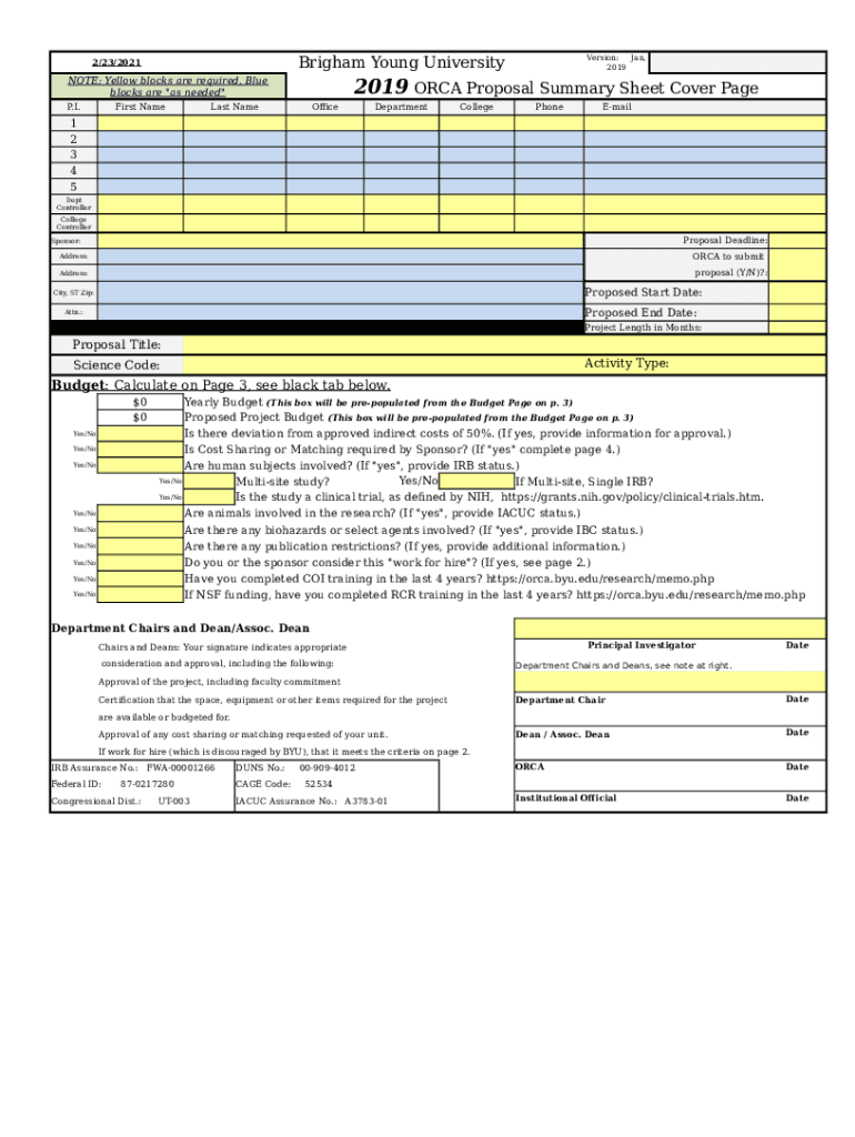 Get the free 2019 ORCA Proposal Summary Sheet Cover Page - orca byu