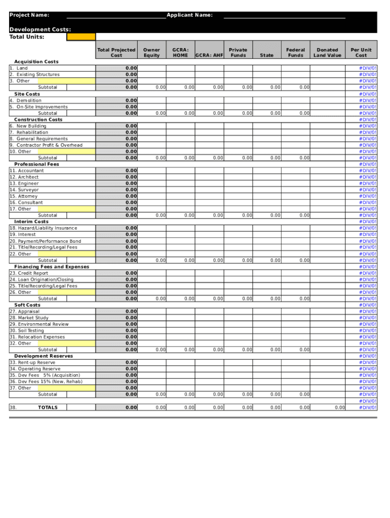 Project Name:Applicant Name:Development Costs: Total Units: Total Projected Cost Acquisition Costs 1. Land 2. Existing Structures 3. Other Subtotal Site Costs 4. Demolition 5. Onsite Improvements