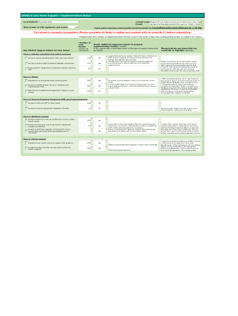 COVID-19 Care Home Support Implementation Status Local AuthoritGloucestershire Total number of CQC registered care homes i×Contact name Margaret Wilcox, Executive Director for Adult Social Care.