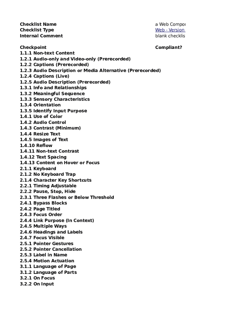 Checklist Name Checklist Type Internal Comments Web Component Web Version 7.1 blank checklist with canned commentCheckpoint Compliant? 1.1.1 Context Content 1.2.1 Audio only and Video only (Prerecorded)