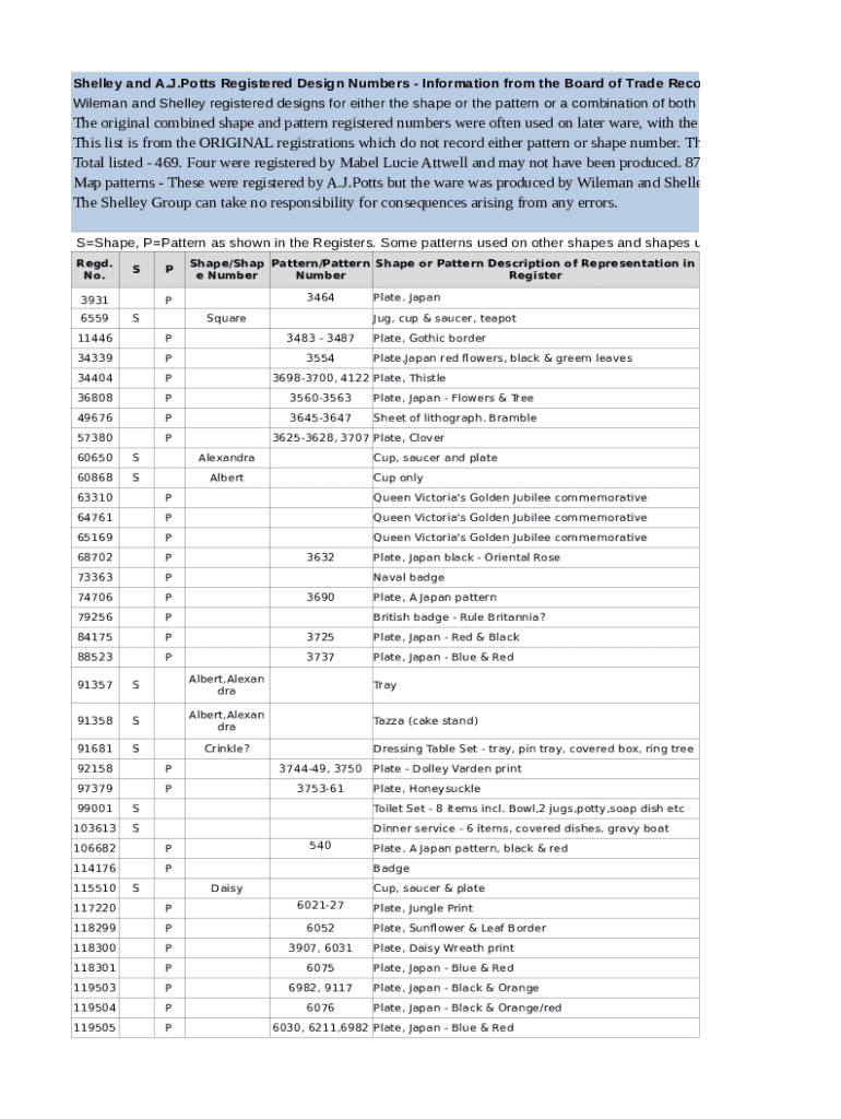 Shelley and A.J. Potts Registered Design Numbers Information from the Board of Trade Records, National Archive Wile man and Shelley registered designs for either the shape or the pattern or a combination
