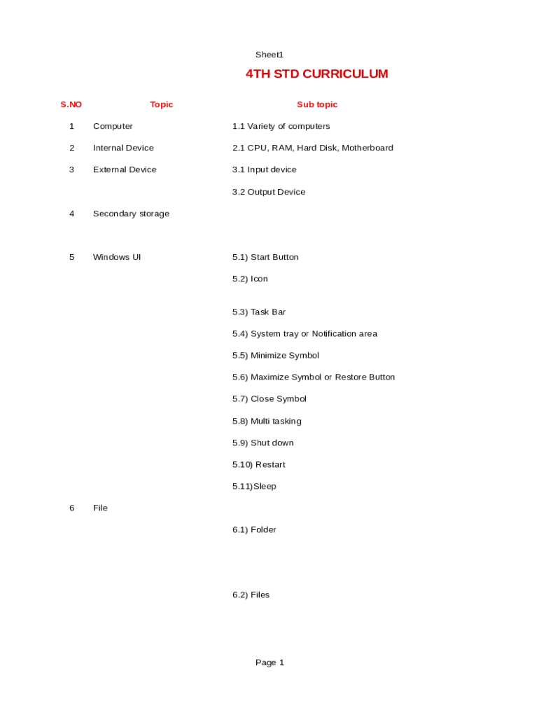 Sheet14TH STD CURRICULUM S.NOTopicSub topic1Computer1.1 Variety of computers2Internal Device2.1 CPU, RAM, Hard Disk, Motherboard3External Device3.1 Input device 3.2 Output Device4Secondary storage5Windows