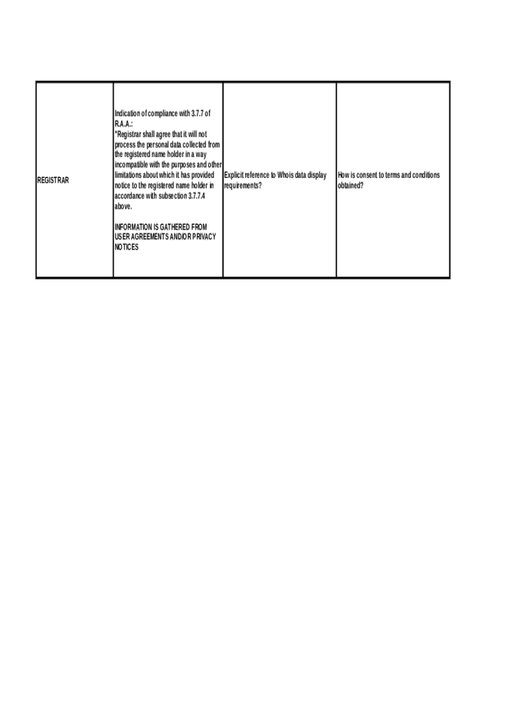 REGISTRARIndication of compliance with 3.7.7 of R.A.A.: “Registrar shall agree that it will not process the personal data collected from the registered name holder in a way incompatible with the