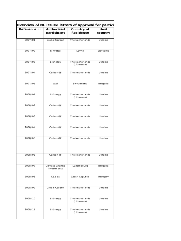 country2007JI01Global Carbonate NetherlandsUkraine2007JI02EkvotasLatviaLithuania2007JI03EEnergyThe