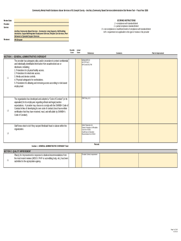 Community Mental Health Substance Abuse Services of St Joseph County Ancillary Community Based Services Administrative Site Review Tool Fiscal Year 2016SCORING INSTRUCTIONS 2 compliance with standard/intent