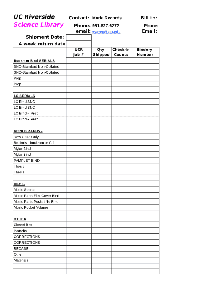 UC Riverside Science LibraryContact: Maria Records Phone: 9518276272 email: marred UCR.bill to: Phone: Email:Shipment Date: 4 week return date UCR Job # Buckram Bind SERIALS Substandard Collated Prep
