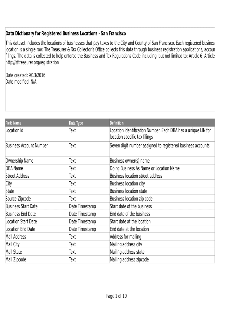Data Dictionary for Registered Business Locations San FranciscoThis dataset includes the locations of businesses that pay taxes to the City and County of San Francisco. Each registered business may
