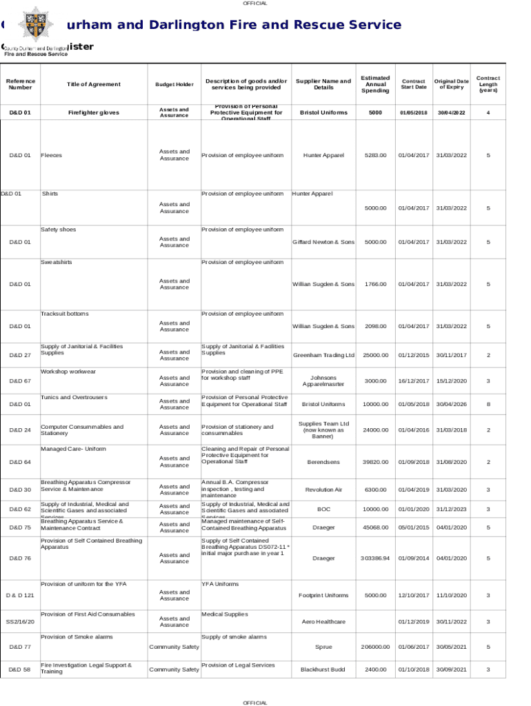 OFFICIALCounty Durham and Darlington Fire and Rescue Service Contract RegisterReference NumberTitle of AgreementBudget HolderDescription of goods and/or services being providedSupplier Name and DetailsEstimated