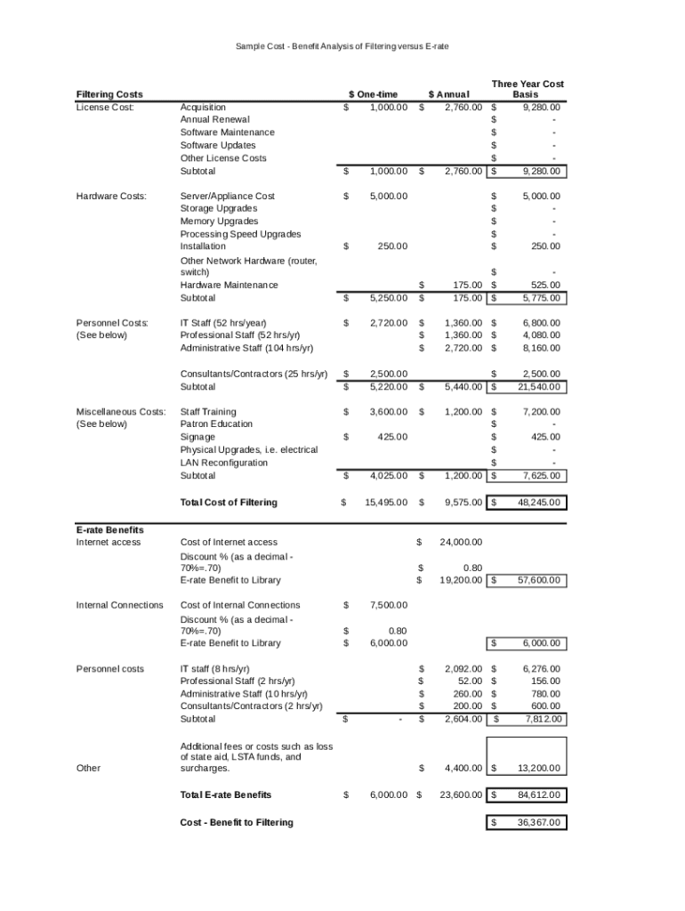 Sample Cost Benefit Analysis of Filtering versus ErateFiltering Costs License Cost:Hardware Costs:Personnel Costs: (See below)Miscellaneous Costs: (See below)Acquisition Annual Renewal Software Maintenance