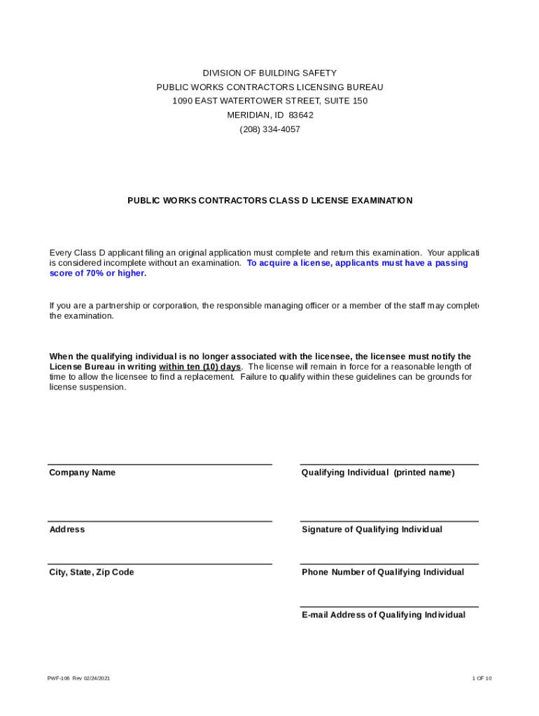 (208) 3344057PUBLIC WORKS CONTRACTORS CLASS D LICENSE EXAMINATIONEvery