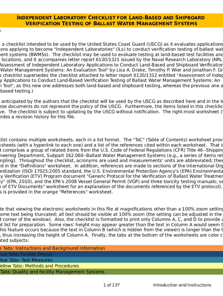 INDEPENDENT LABORATORY CHECKLIST FOR LANDED AND SHIPBOARD VERIFICATION TESTING OF BALLAST WATER MANAGEMENT SYSTEMS BS a checklist intended to be used by the United States Coast Guard (USCG) as it