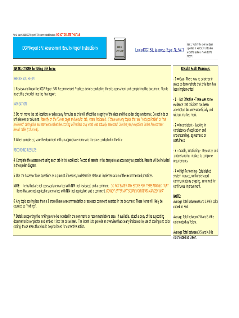 This document contains assessment results and instructions for conducting site assessments following the IOGP Report 577 recommended practices, focusing on safety protocols in various operational