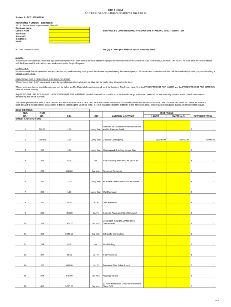 BID FORM ACCESS DRIVE IMPROVEMENTS PHASE III Section 3 REF 171C909036 REFERENCE NUMBER: 171C909036 TITLE: Access Drive Improvements Phase all Company Name: Contact Name: Address1: Address 2: Telephone: