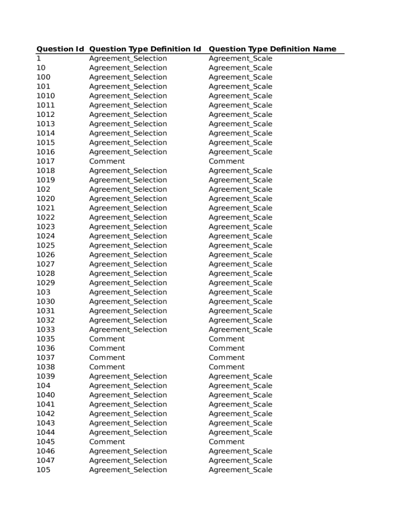 Question I'd Question Type Definition I'd 1 Agreement Selection 10 Agreement Selection 100 Agreement Selection 101 Agreement Selection 1010 Agreement Selection 1011 Agreement Selection 1012 Agreement