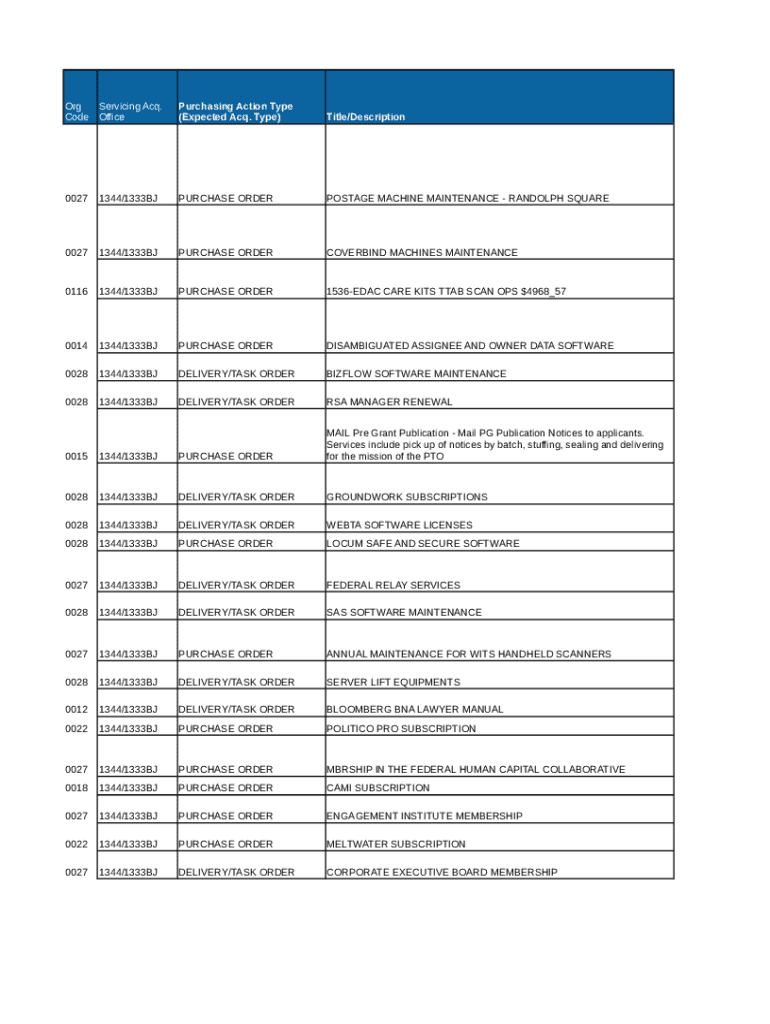 Org Servicing Act. Code OfficePurchasing Action Type (Expected Act. Type)Title/Description00271344/1333BJPURCHASE ORDERPOSTAGE MACHINE MAINTENANCE RANDOLPH SQUARE00271344/1333BJPURCHASE ORDERCOVERBIND