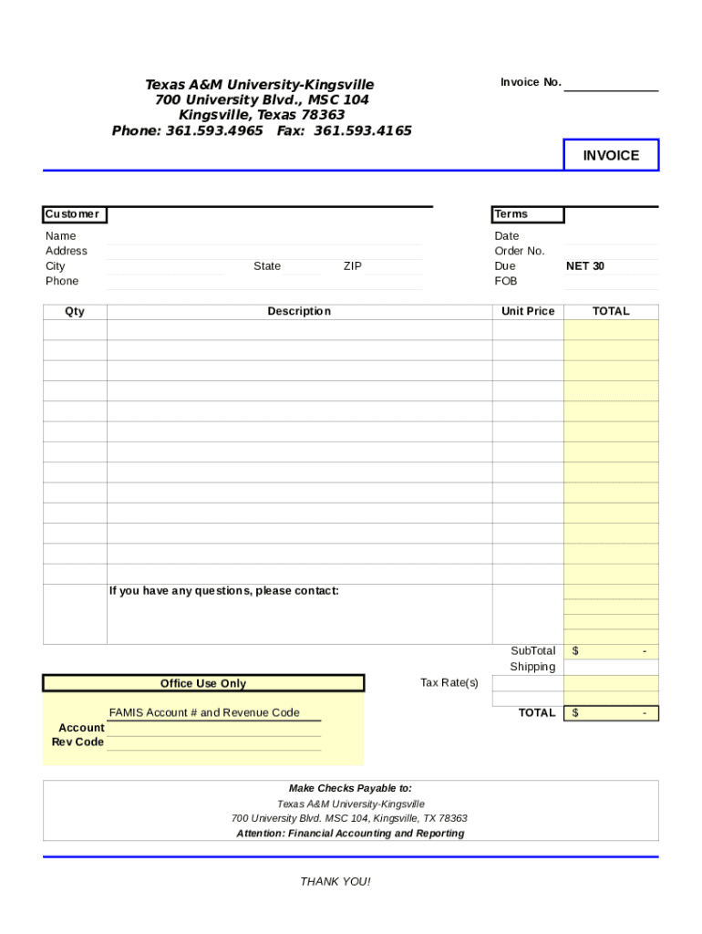 Invoice No. Texas A&M UniversityKingsville 700 University Blvd., MSC 104 Hinesville, Texas 78363 Phone: 361.593.4965 Fax: 361.593.4165INVOICECustomerTermsName Address City Phone Date Order No. Do