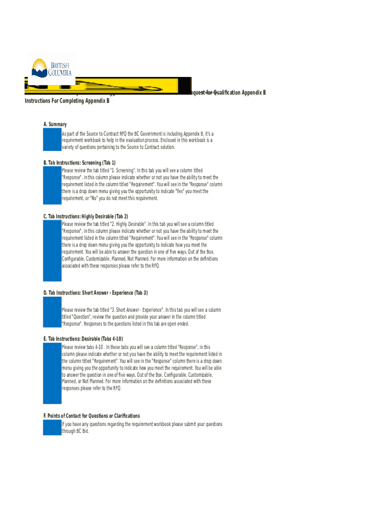 British Columbia Ministry of Technology, Innovation and Citizens Services Request for Qualification Appendix B Instructions For Completing Appendix BA. Summary As part of the Source to Contract RFQ