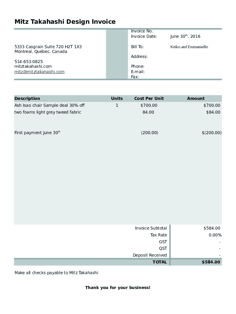 Ritz Takanashi Design Invoice5333 Castries Suite 720 H2T 1×3