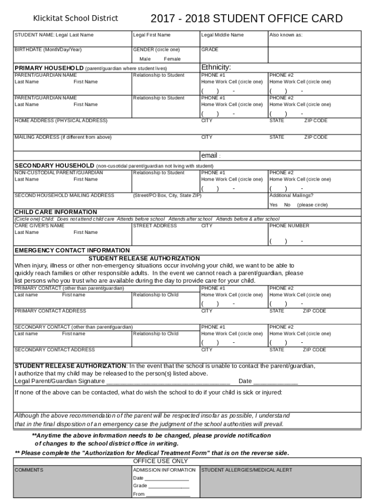 2017 2018 STUDENT OFFICE CARDKlickitat School District STUDENT NAME: Legal Last Nameless First Nameless Middle NameBIRTHDATE (Month/Day/Year)GENDER (circle one)GRADEMaleAlso known as:FemalePRIMARY