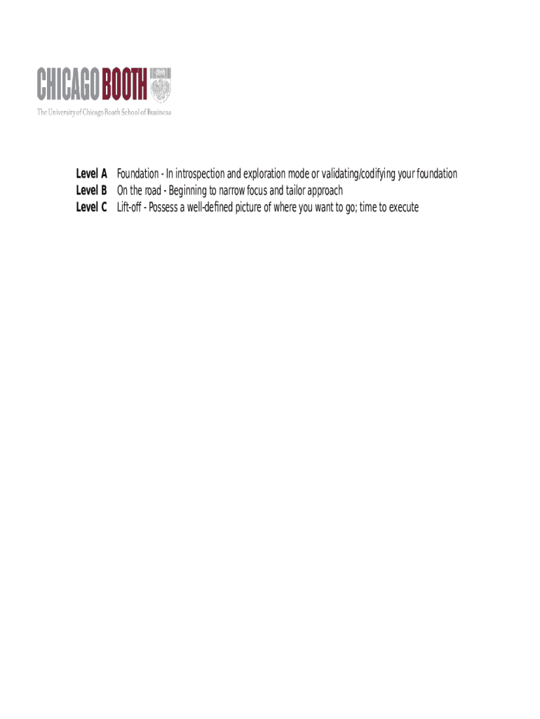 Level A Level B Level Foundation In introspection and exploration mode or validating/codifying your foundation On the road Beginning to narrow focus and tailor approach Liftoff Possess a well-defined