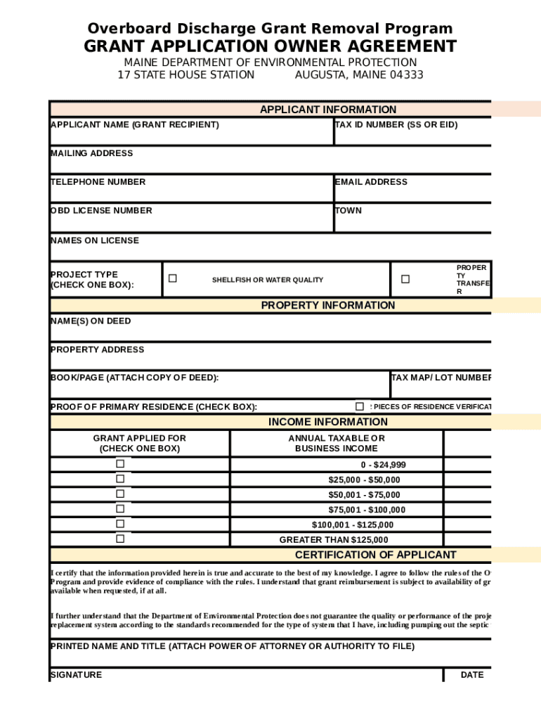 The Overboard Discharge Grant Application is a government form used by Maine residents to apply for grants aimed at removing overboard discharge systems.