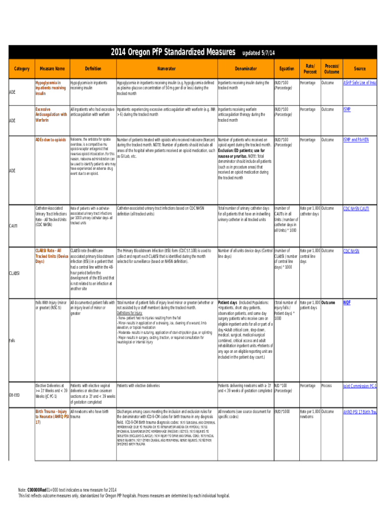 2014 Oregon PFP Standardized Measures CategoryMeasure NameDefinitionADEHypoglycemia in inpatients receiving insulinHypoglycemia in inpatients receiving insulinADEExcessive Anticoagulation with WarfarinCLABSIHypoglycemia
