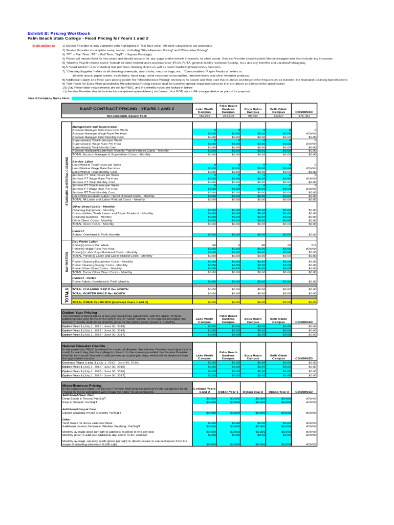 Exhibit B: Pricing Workbook Palm Beach State College Fixed Pricing for Years 1 and 2 Instructions:1) Service Provider to only complete cells highlighted in Teal Blue color. All other calculations