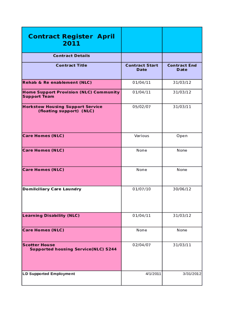 Contract Register April 2011 Contract Details Contract TitleContract Start Precontract End DateRehab & Re enablement (NFC)01/04/1131/03/12Home Support Provision (NFC) Community Support Team01/04/1131/03/12Horkstow