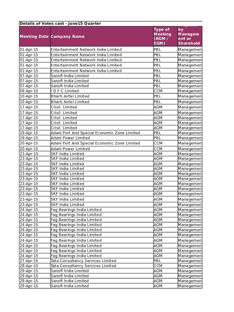 Details of Votes cast June15 Quarter Meeting Date Company Namely of Meeting (AGM / EGG)01Apr15 01Apr15 01Apr15 01Apr15 01Apr15 07Apr15 07Apr15 07Apr15 09Apr15 10Apr15 17Apr15 17Apr15 17Apr15 17Apr15