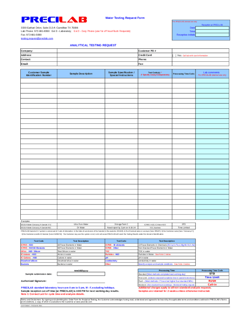 Water Testing Request Form For PRE-LAB internal use onlyReception at PRECILAB3330 Earhart Drive, Suite 212A Carrollton TX 75006 Lab Phone: 9726618360 Ext 0 Laboratory; Ext 3 Duty Phone (use for off