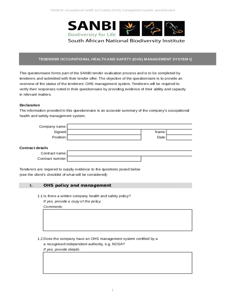 Tenderer occupational health and safety (OHS) management system questionnaireTENDERER OCCUPATIONAL HEALTH AND SAFETY (OHS) MANAGEMENT SYSTEM Questionnaires questionnaire forms part of the SAN tender