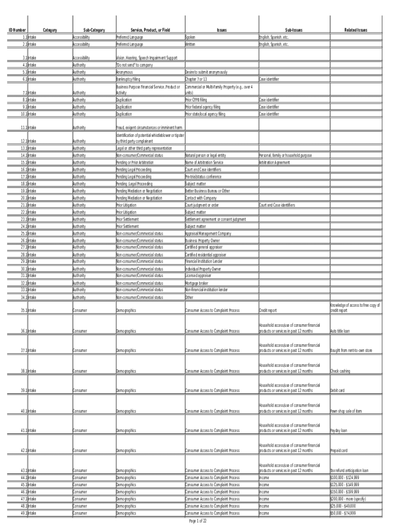 ID NumberCategorySubCategoryService, Product, or Field1.1 Intake 2.1 IntakeAccessibility AccessibilityPreferred Language Preferred Language3.1 Intake 4.1 IntakeAccessibility AuthorityVision, Hearing,