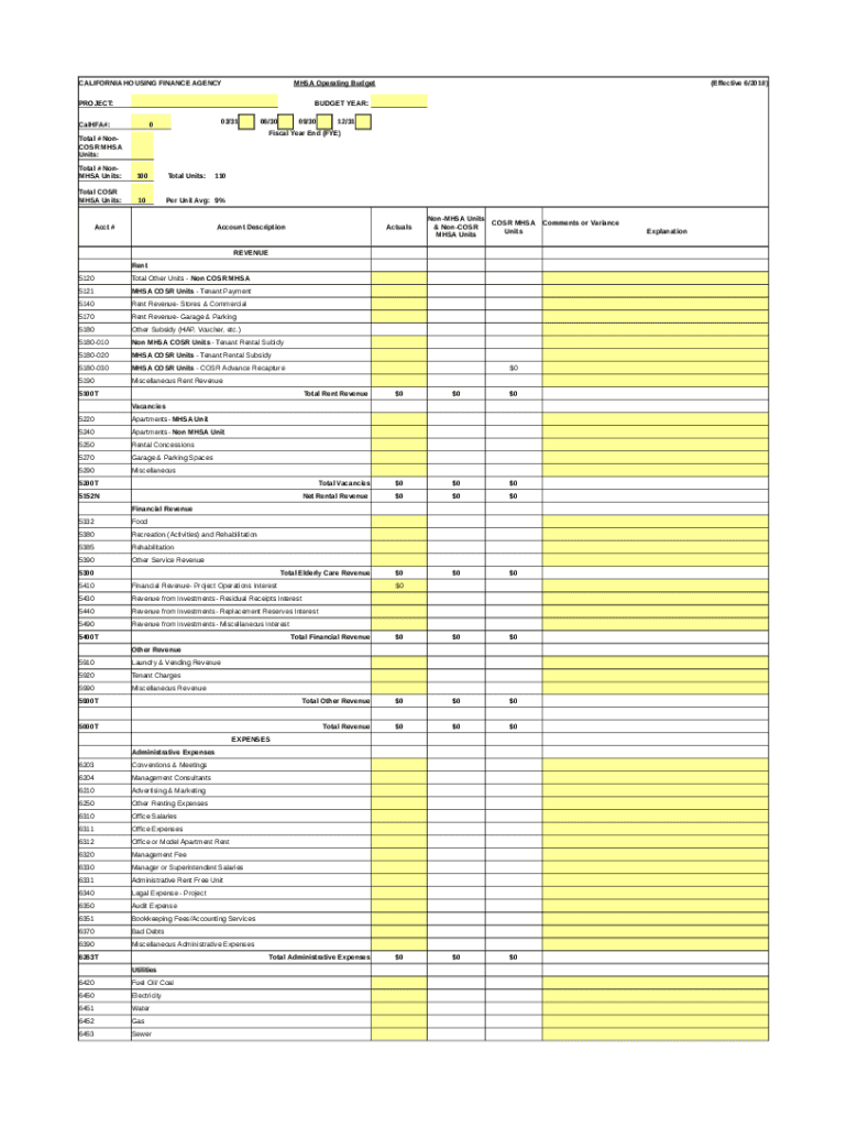 CALIFORNIA HOUSING FINANCE AGENCYMHSA Operating BudgetPROJECT:(Effective 6/2018)BUDGET YEAR:Calf#:03/31006/3009/3012/31Fiscal Year End (FYE)Total # Noncom MESA Units: Total # Months Units:100Total