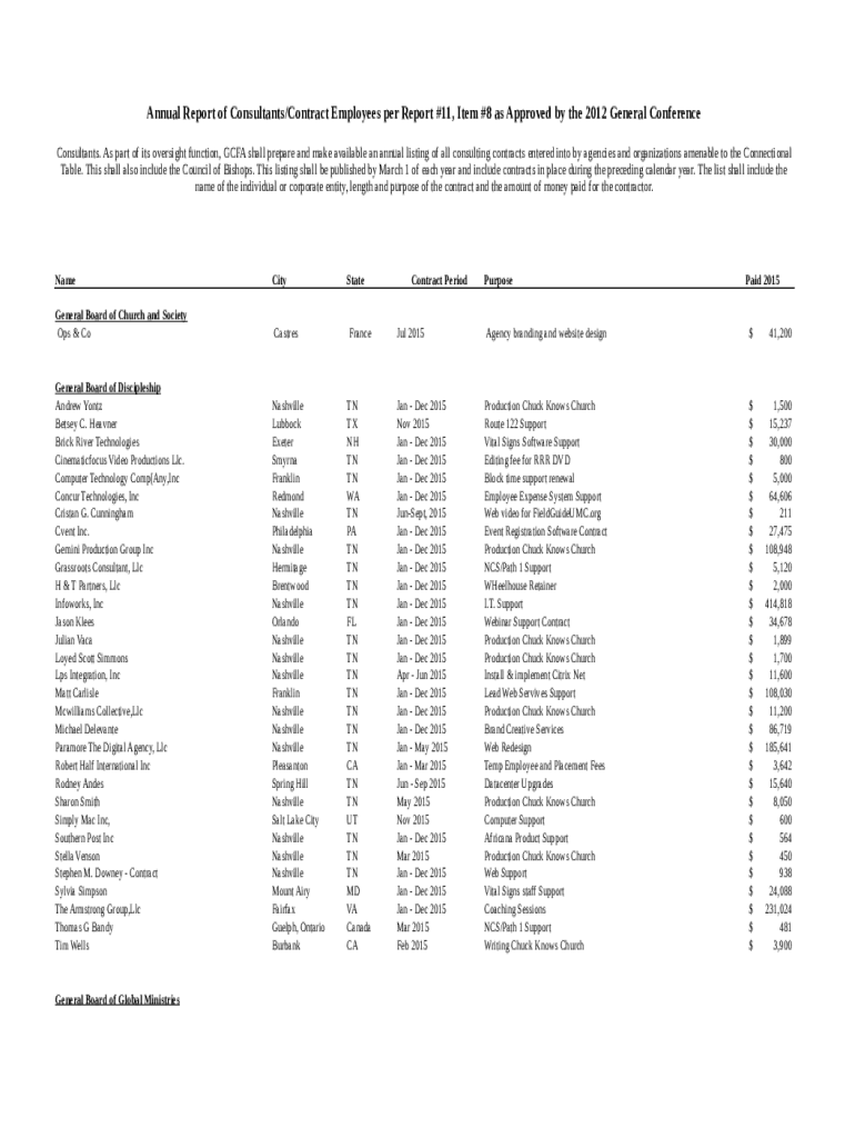Annual Report of Consultants/Contract Employees per Report #11, Item #8 as Approved by the 2012 General Conference