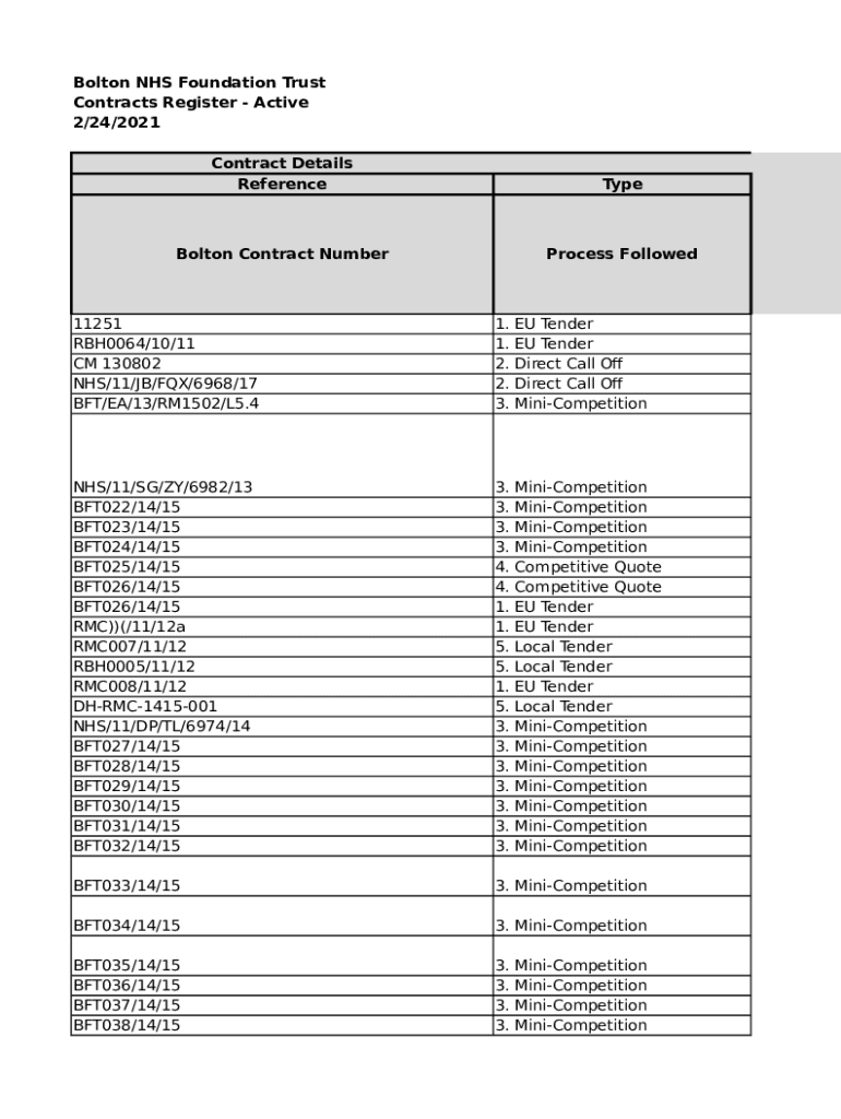 Bolton NHS Foundation Trust Contracts Register Active 2/24/2021 Contract Details ReferenceTypeBolton Contract NumberProcess Followed11251 RBH0064/10/11 CM 130802 NHS/11/JB/FIX/6968/17 BFT/EA/13/RM1502/L5.41.