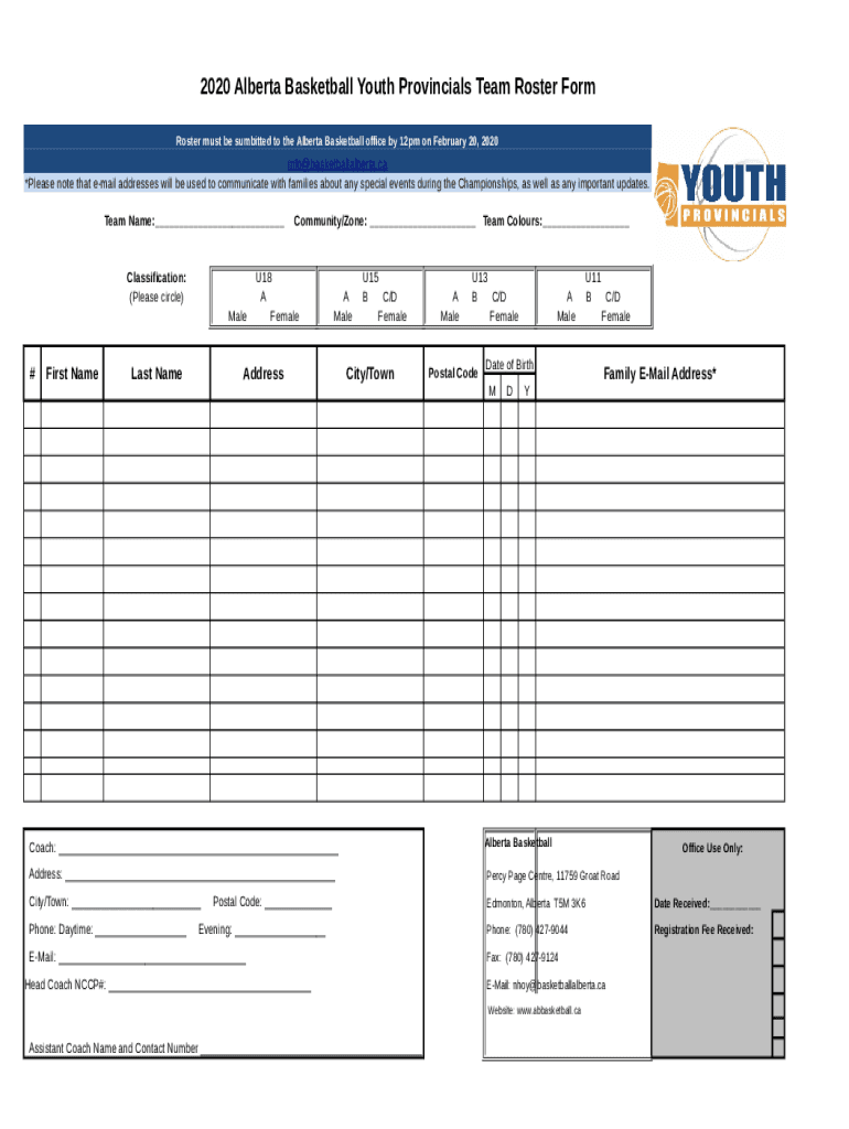 2020 Alberta Basketball Youth Provincials Team Roster Form Roster must be submitted to the Alberta Basketball office by 12pm on February 20, 2020info basketballalberta.ca *Please note that email addresses