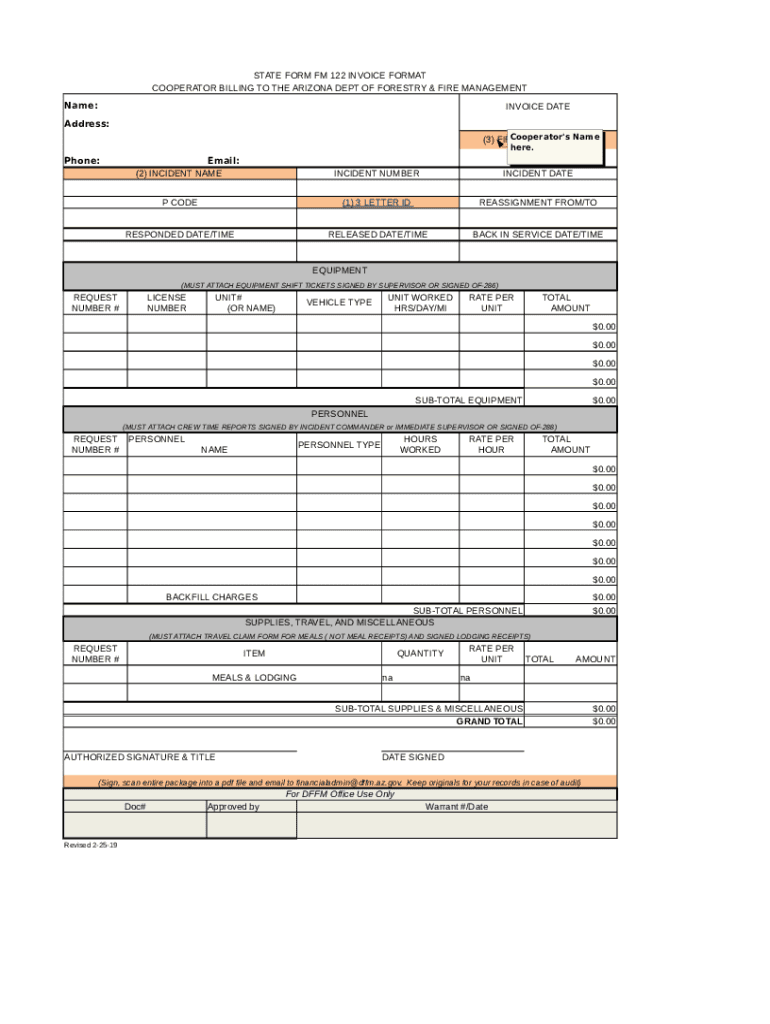 STATE FORM FM 122 INVOICE FORMAT COOPERATOR BILLING TO THE ARIZONA DEPT OF FORESTRY & FIRE MANAGEMENT Name:INVOICE Headdress: Cooperator's Name (3) FIRE DEPT INVOICE # here. Phone:Email: (2) INCIDENT