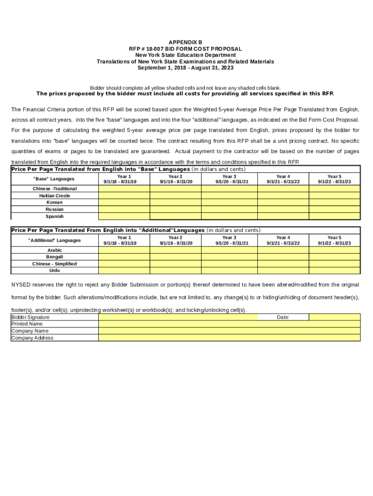 APPENDIX B RFP # 18007 BID FORM COST PROPOSAL New York State Education Department Translations of New York State Examinations and Related Materials September 1, 2018, August 31, 2023, Bidder should