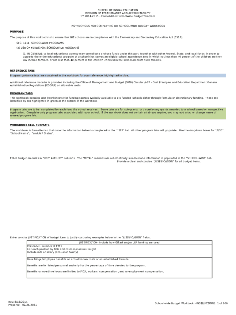 BUREAU OF INDIAN EDUCATION DIVISION OF PERFORMANCE AND ACCOUNTABILITY SY 20142015 Consolidated School wide Budget TemplateINSTRUCTIONS FOR COMPLETING BE SCHOOLKID BUDGET WORKBOOK PURPOSE The purpose