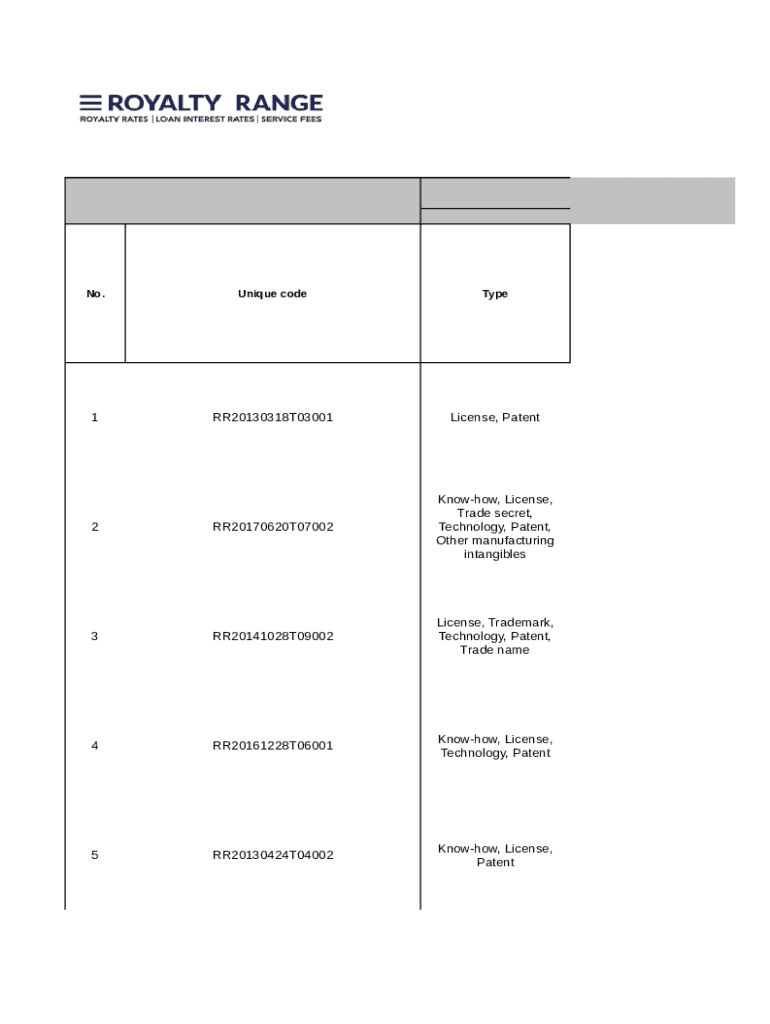 No. Unique codeType1RR20130318T03001License, Patent2RR20170620T07002Knowhow, License,