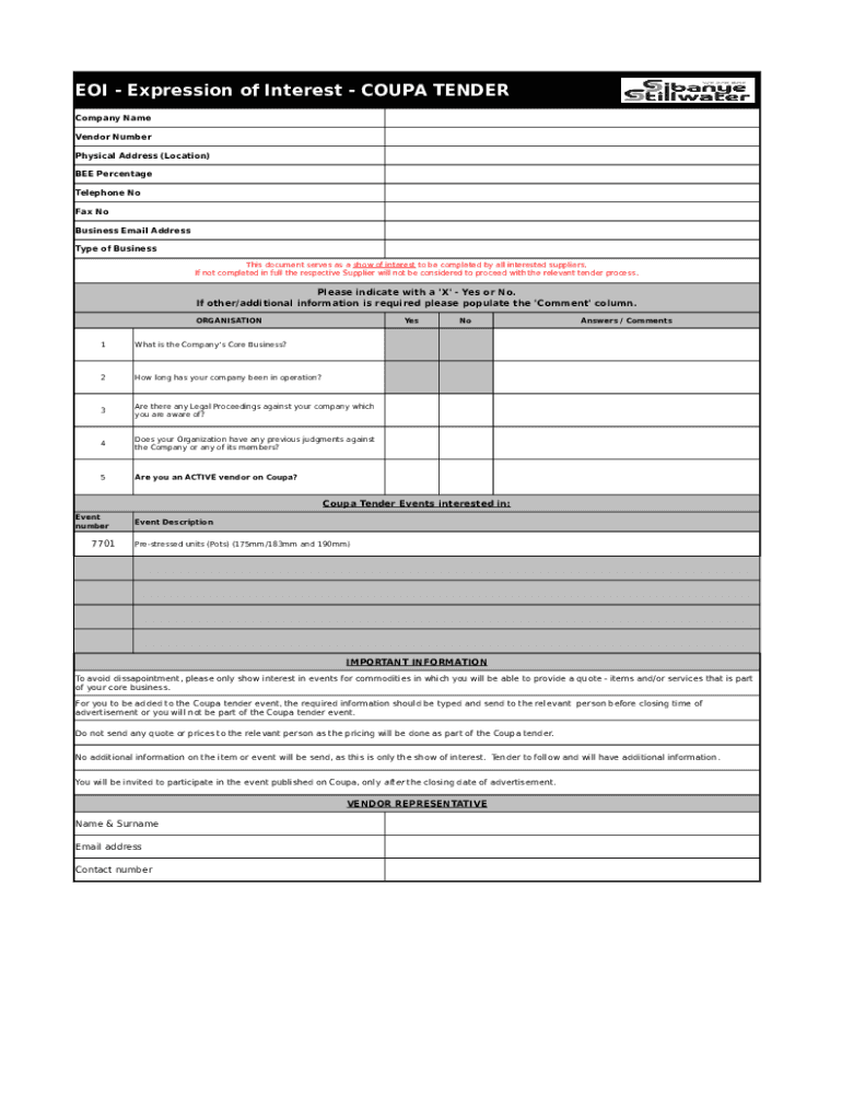 EOI Expression of Interest COUP TENDER Company Name Vendor Number Physical Address (Location) BEE Percentage Telephone No Fax No Business Email Address Type of Business This document serves as a show