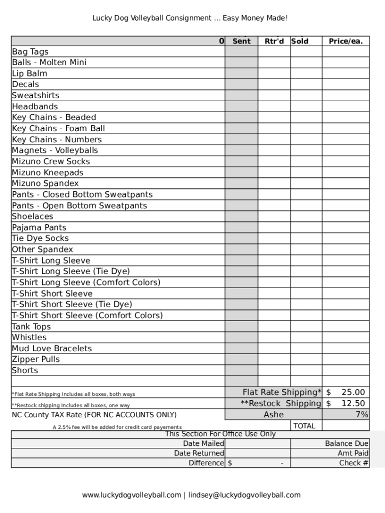 Lucky Dog Volleyball Consignment Easy Money Made!0Qty Entity RTR 'duty Sold Price/ea. Bag Tags Balls Molten Mini Lip Balm Decals Sweatshirts Headbands Key Chains Beaded Key Chains Foam Ball Key Chains