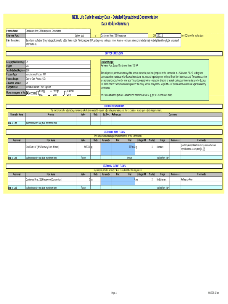 NET Life Cycle Inventory Data Detailed Spreadsheet Documentation DS Sheet Information Process Name:Continuous Miner, 755 Horsepower, ConstructionBased on manufacturer (Cyrus) specifications for a