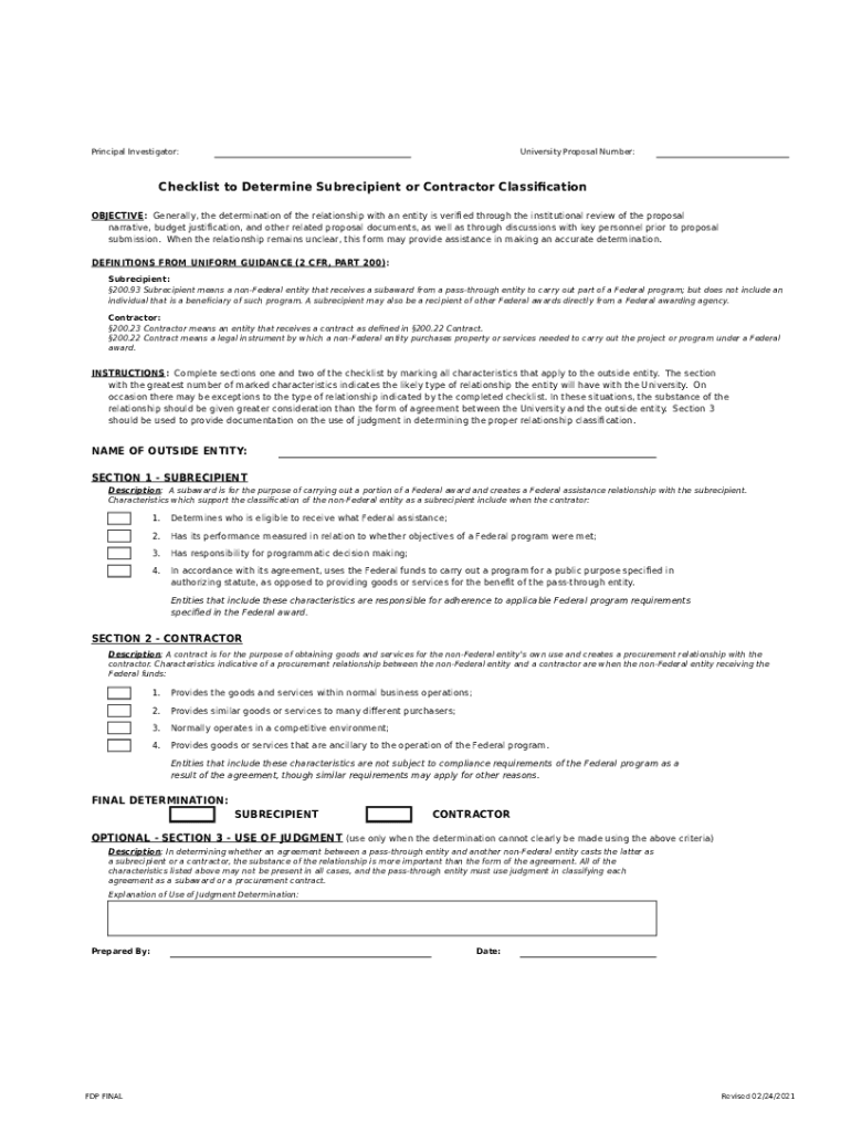 Principal Investigator:University Proposal Number:Checklist to Determine Subrecipient or Contractor Classification