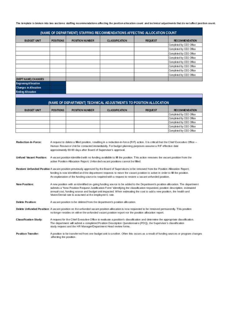 The template is broken into two sections: staffing recommendations affecting the position allocation count and technical adjustments that do not affect position count.(NAME OF DEPARTMENT) STAFFING