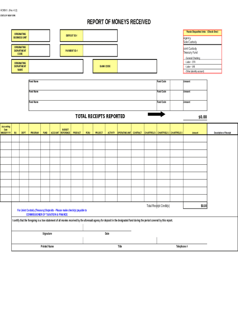 AC909S (Rev. 4/12) STATE OF NEW YORKREPORT OF MONEYS RECEIVED Funds Deposited into: (Check One)ORIGINATING BUSINESS UNITDEPOSIT ID #ORIGINATING DEPARTMENT CO-PAYMENT ID #Agency Sole Custody Joint