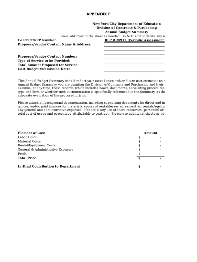 APPENDIX F New York City Department of Education Division of Contracts & Purchasing Annual Budget Summary Please add rows to the sheet as needed. Do NOT add or delete any worksheet columns. Contract/RFP